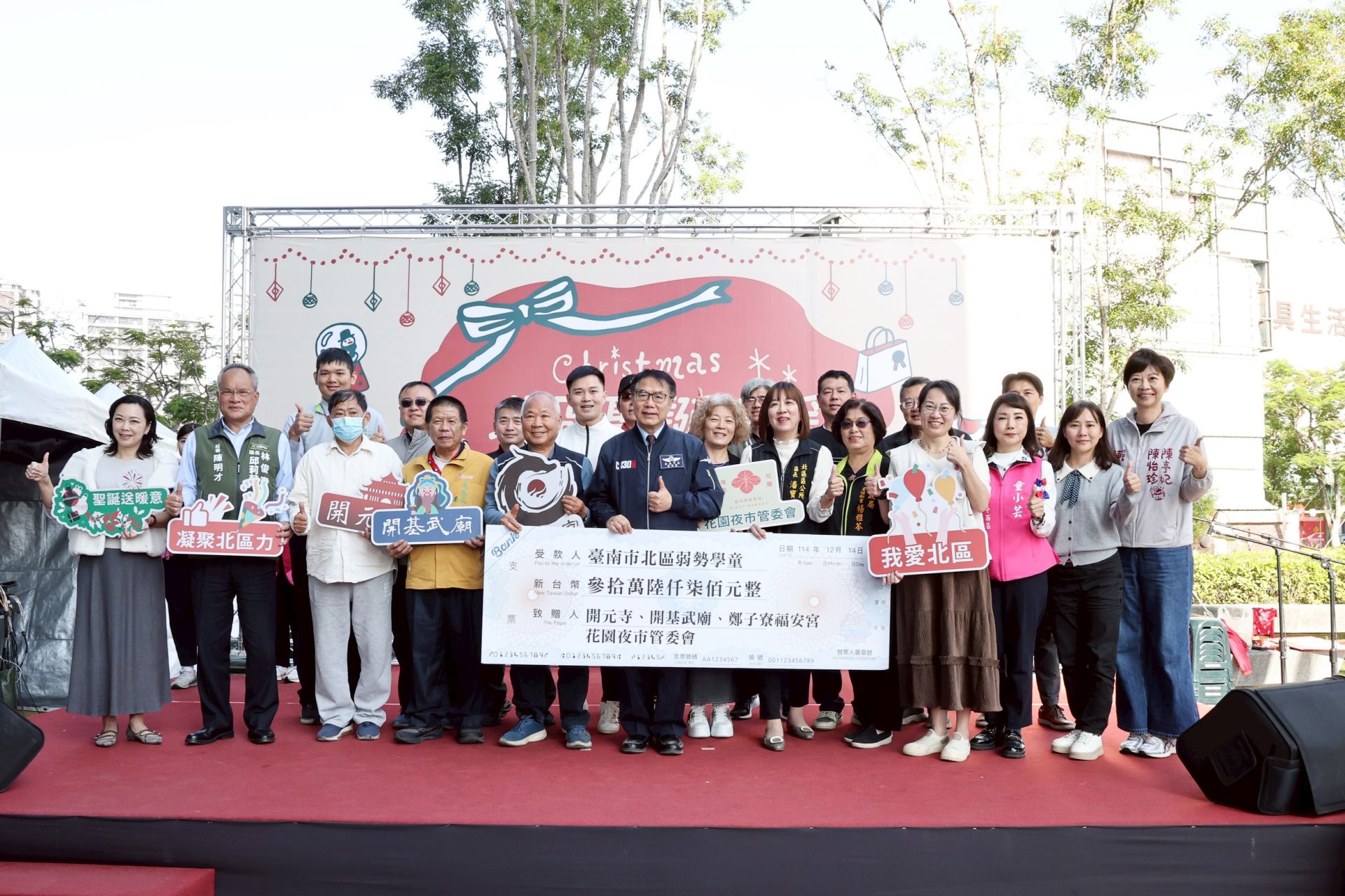 市長黃偉哲表示,感謝新光三越小北門店熱心提供活動場地,並祝福業績蒸蒸日上。本次活動由民間團體捐助現金共計22萬5,300元,另由花園夜市管委會及蔡明先生贊助8萬1,400元花園夜市消費券,提供本區257位弱勢學生作為聖誕禮物;同時,北區民間團體也捐助6萬元現金及價值約8萬元的兒童物資,轉贈北區善牧嬰兒之家。感謝開元寺、鄭子寮福安宮、開基武廟、花園夜市管委會、北區商家、里長聯誼會及所有善心人士的慷慨付出,期盼透過此次活動激起更多善的循環,讓愛心持續傳遞、溫暖人心。