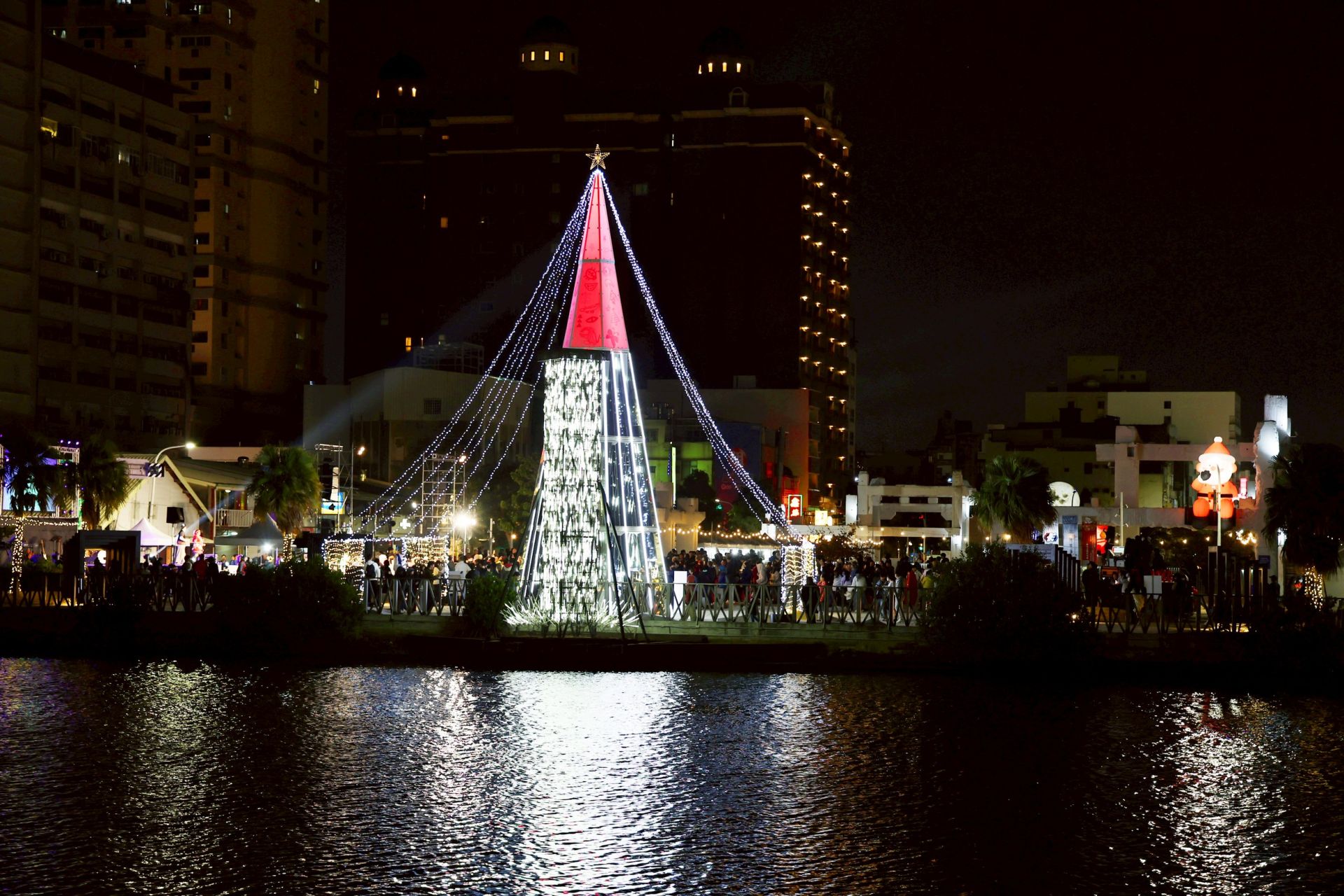 ▲「光之旅程」主題耶誕樹於晚間正式點燈,燈光倒映水面,點亮整個運河河樂燈區,為台南增添溫馨、歡樂與平安的耶誕氛圍。(新聞處 提供)