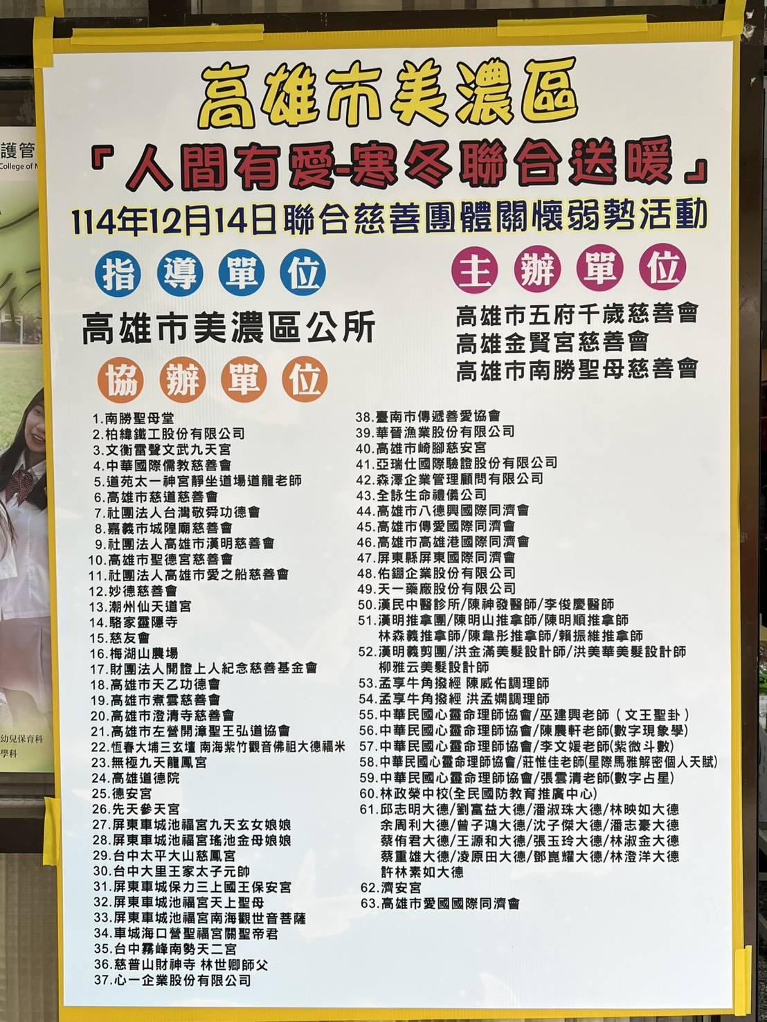 114年12月14日星期日,高雄市美濃區在冬日的微寒清晨中,因為一份份溫暖的關懷而格外溫馨。美濃區公所聯合多個慈善團體及地方善心大德,共同舉辦「寒冬送暖聯合物資發放」活動,為區內弱勢家庭與獨居長者送上最實際的支持與祝福。