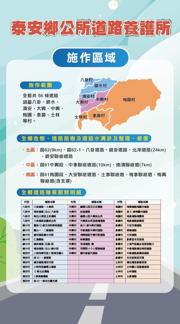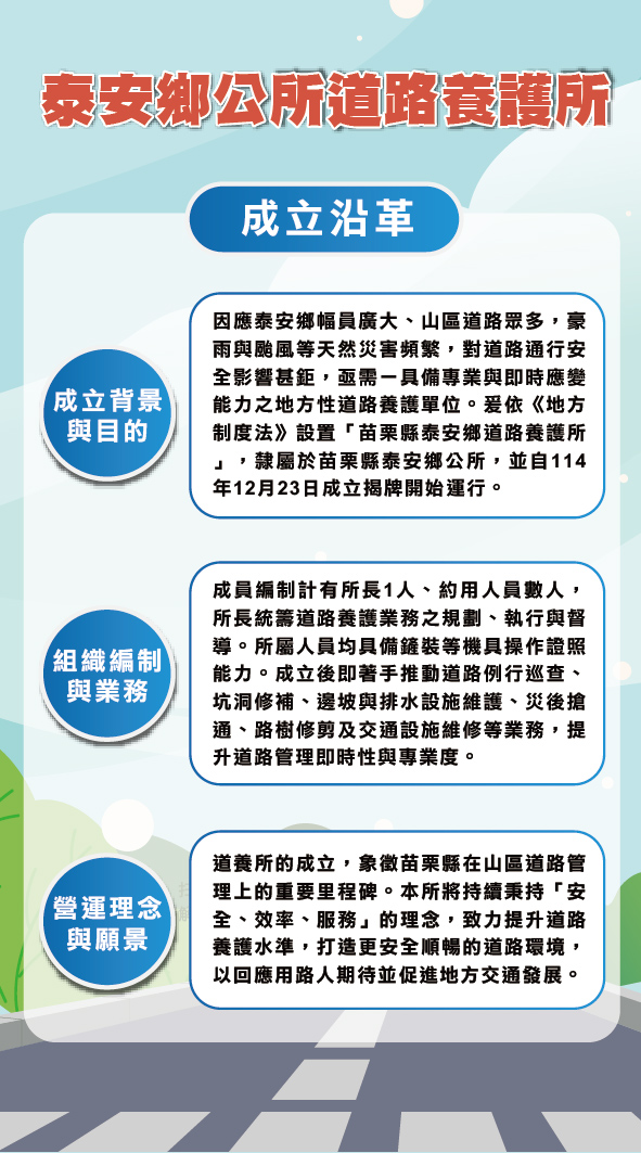 泰安鄉幅員遼闊,山區道路眾多,包括苗62線、61線、縣道140線及多條聯絡道路,每逢豪雨或颱風侵襲,常發生落石、坍方情形,嚴重影響居民通行與緊急救援效率。過去道路養護多仰賴外包搶修與臨時調度,人力與效率有限,為徹底改善偏鄉道路長期維護不易的問題,泰安鄉公所依《地方制度法》規定,設置隸屬於公所的「苗栗縣泰安鄉道路養護所」,並於114年12月23日正式揭牌運作。