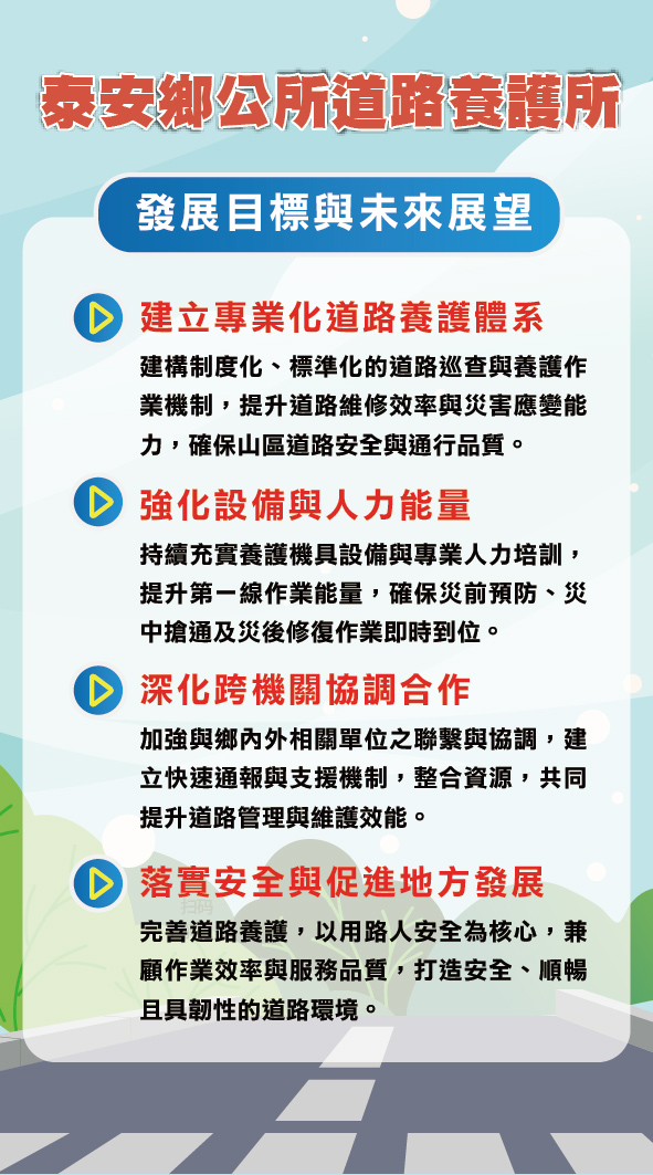 泰安鄉公所指出,未來將持續完善道路養護作業機制,逐步強化機具設備配置,並與鄉內外相關單位密切協調合作。道路養護所將秉持「安全、效率、服務」的理念,打造更安全順暢的用路環境,為地方交通發展與整體建設奠定穩固基礎。