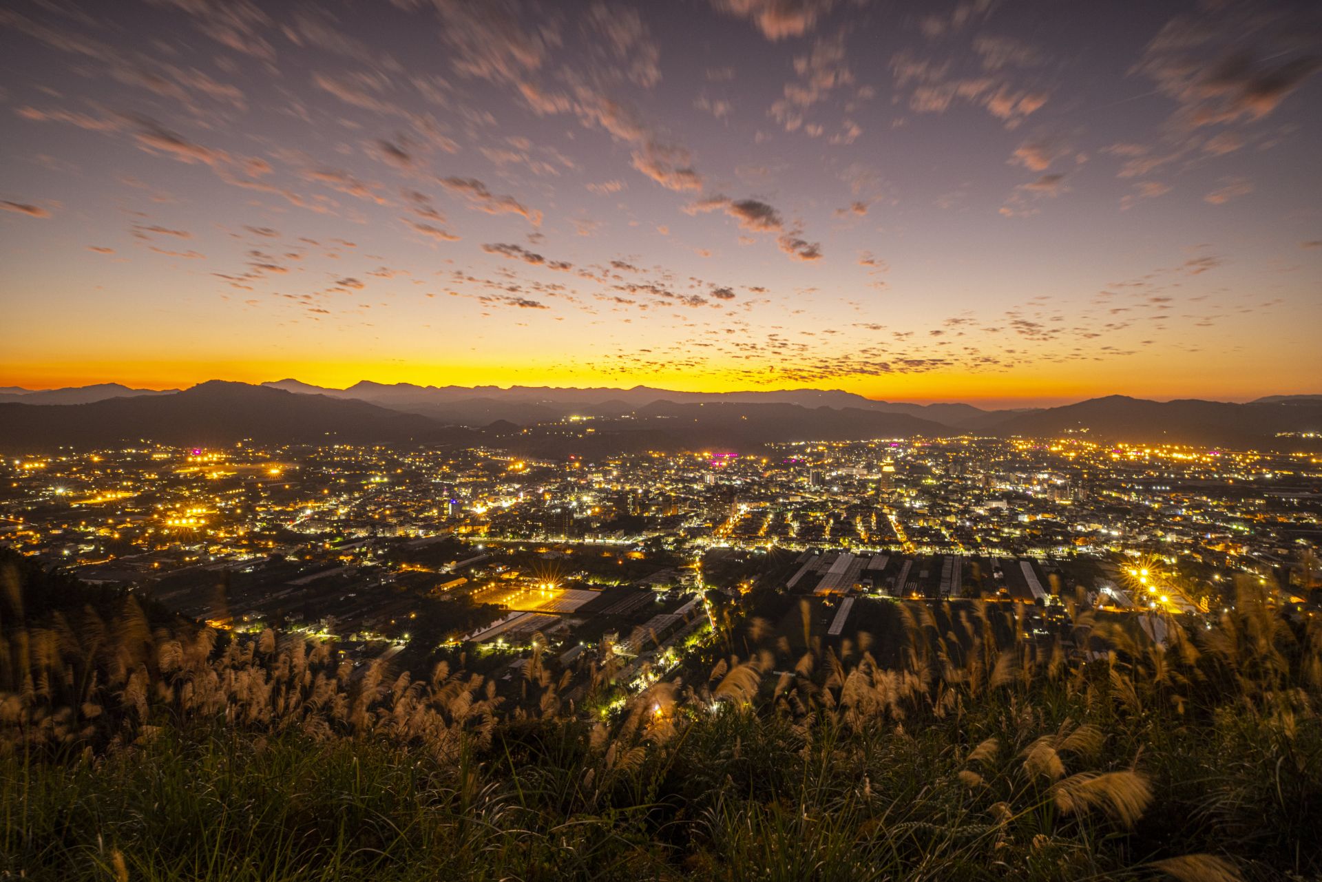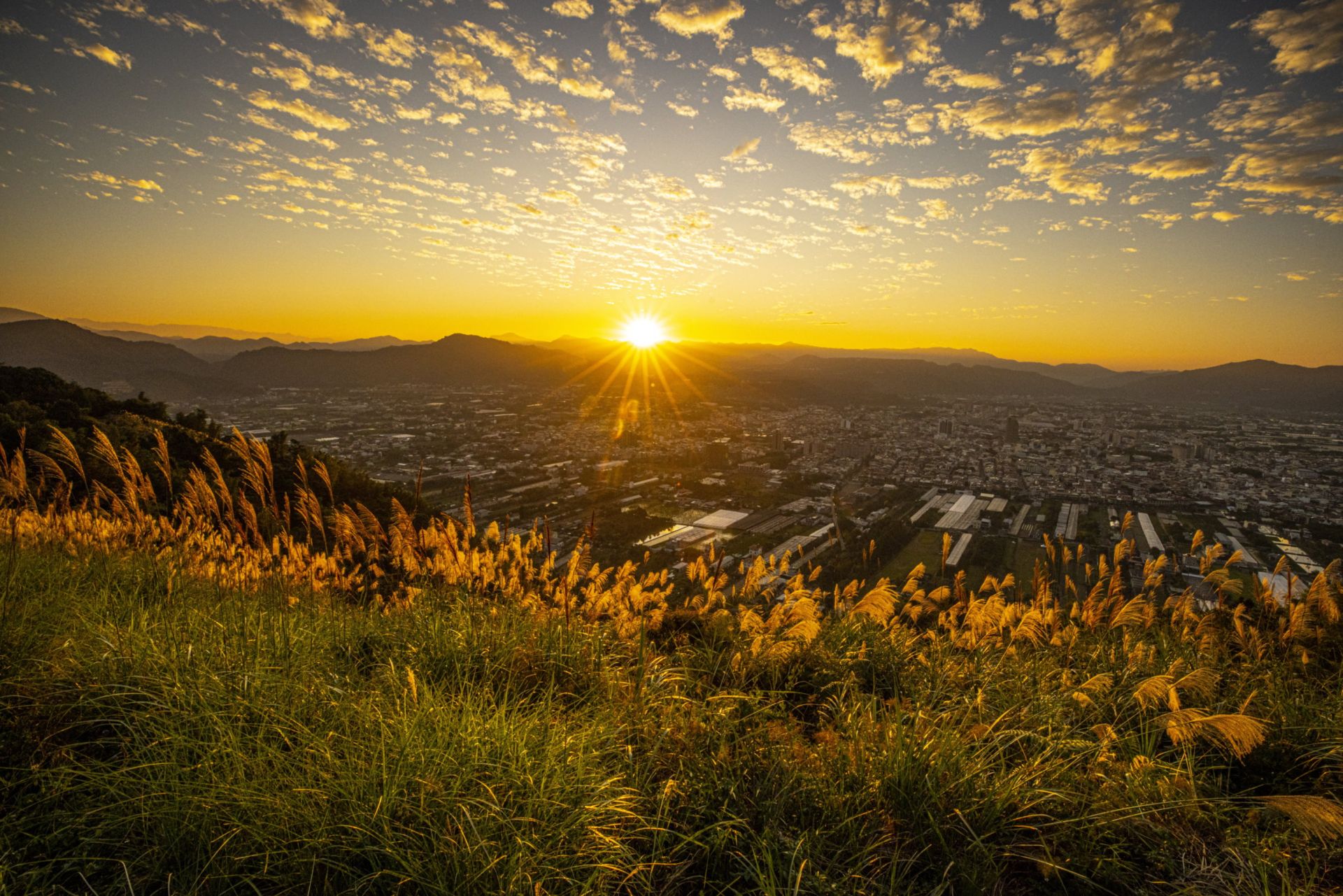 日落前夕由鯉魚潭回登『虎頭山』,等待一天最動人的時刻。夕陽緩緩沉入山巒稜線,金色光芒灑滿草坡與城市,遠方埔里街景逐漸染上暖橙色調,雲層被夕照勾勒出細緻層次,為旅程畫下深刻句點。