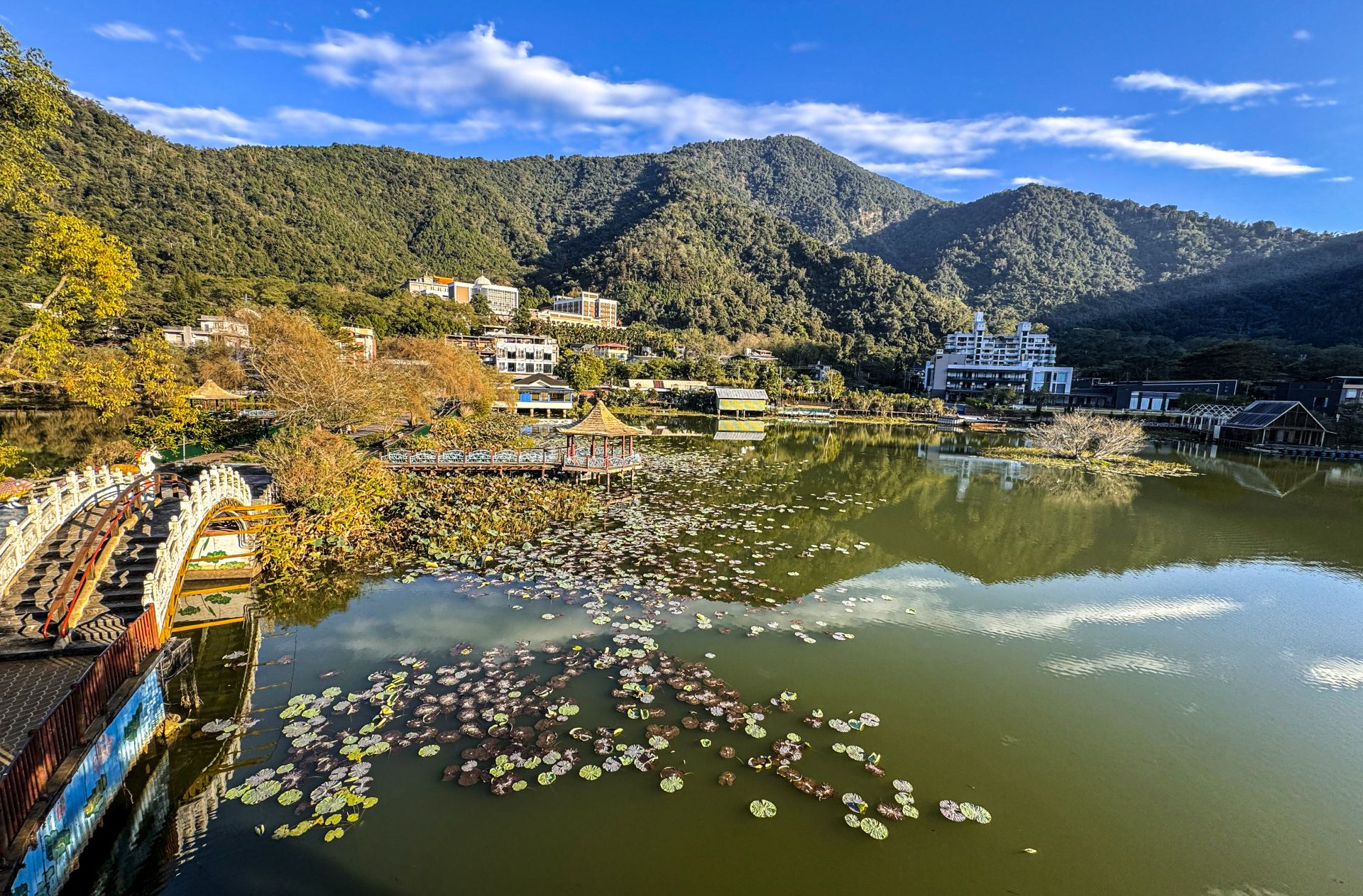 午後轉往埔里,車行經地理中心碑上『虎頭山』,虎頭山上步行下切鯉魚潭漫行 (步道約1.7公里)。午後的鯉魚潭湖面如鏡,倒映群山與白雲,低矮的山城建築點綴其間,讓人感受埔里盆地特有的寬闊與安定。步道寬敞微陡但易行,適合親子與輕旅行族群,在冬日微風中,更顯從容。
