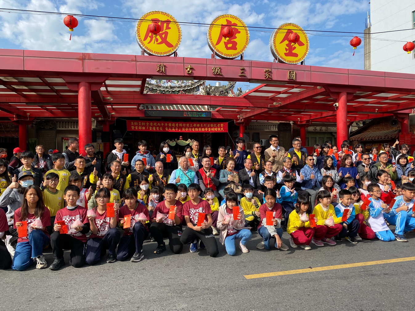 與會貴賓為許願牆揭幕、吊許願牌後,由主委黃維明等人舉行「金唐有愛、香火萬年」頒發獎助學金,高中每人8千元、國中每人5千元、國小每人3千元計14所74名學子受惠,強調捐贈人會繼續支持獎助金活動。