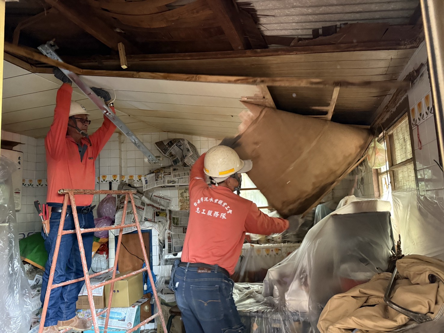 官田區個案為41年次的陳女士,為丹娜絲颱風的受災户。喪偶與兒子同住,兒子身體狀況不佳,只能打零工賺取微薄收入。陳女士每月領取中低收老人生活津貼約4,000多元。目前居住之房屋屋頂、廚房受損,因經濟困難,無力負擔房屋修繕費用。勞工局接獲通報後,經做工行善團場勘隨即展開修繕工程: 泥水工會拆除屋內天花板,當日官田區長洪聰發親自前來案家帶飲料慰勞志工。今日電子加工工會接力,進行水槽水、水切施作;泥水工會進行屋瓦修繕、防水施作,官田區公所團隊也帶飲品到場為志工打氣,大家不計辛勞的付出為社會公益貢獻真誠,讓原本破舊的房屋重現新貌,為弱勢家庭打造安心居住的家園。