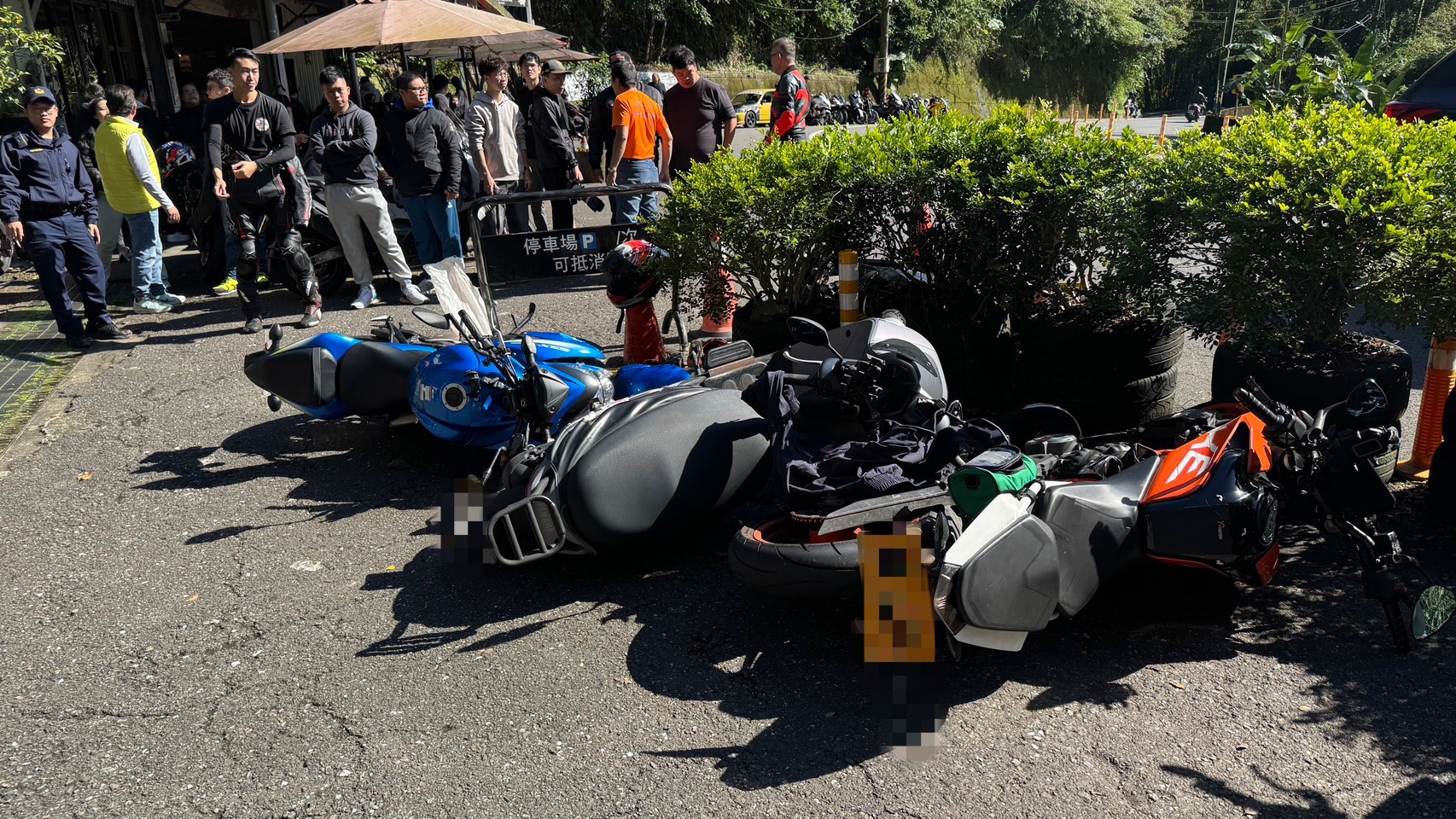 經了解機車騎士林男(27歲)越級駕駛大型重機,行經該處坪林往新店方向過彎打滑自摔,並滑行至彎道旁停車場內與停放之三輛機車 發生碰撞(一輛普重機、兩輛大型重機)。