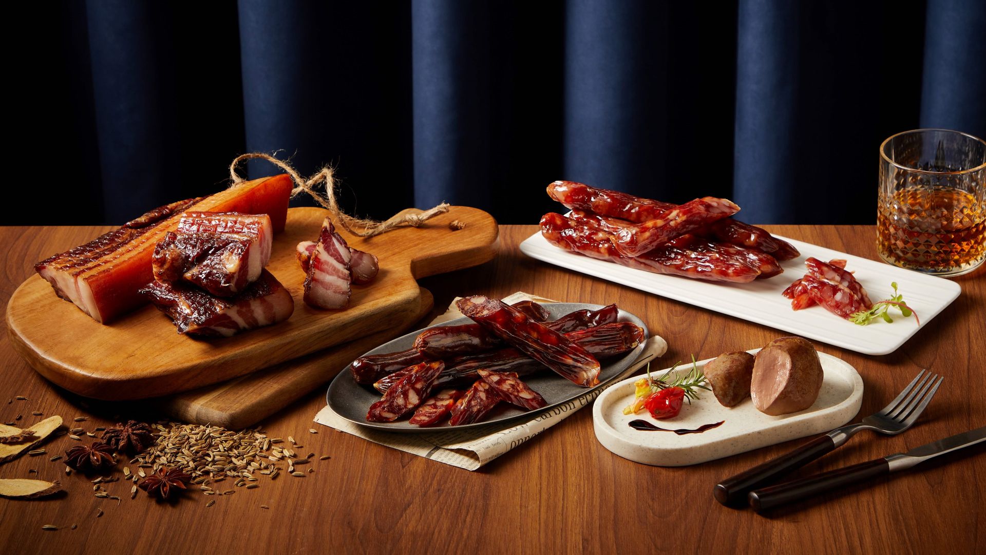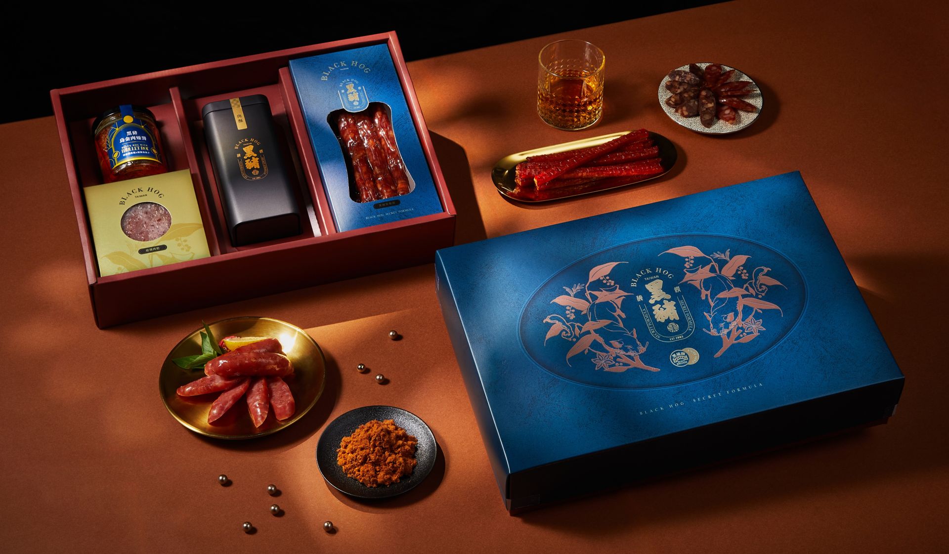 除了內容物的用心,禮盒外觀設計同樣講究。深藍色仿皮革紋理盒身,低調中帶著細膩溫度;設計靈感取自傳統版畫,將香腸靈魂的香辛料元素轉化為雕刻圖騰,並以現代雷射工藝點綴,隨光線流轉閃耀柔和光澤。