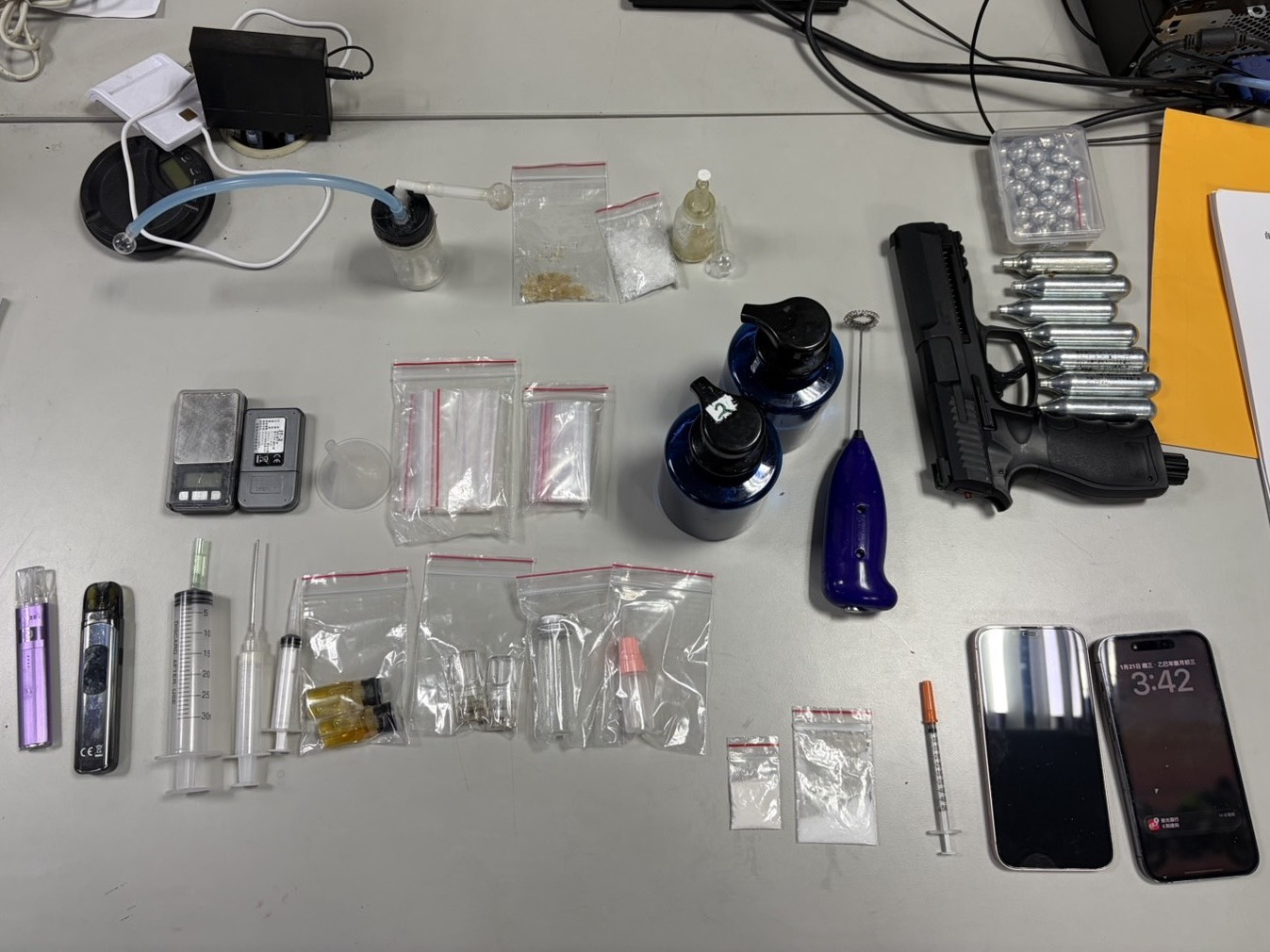 警方逮捕蘇男起出的毒品等證物。翻攝畫面