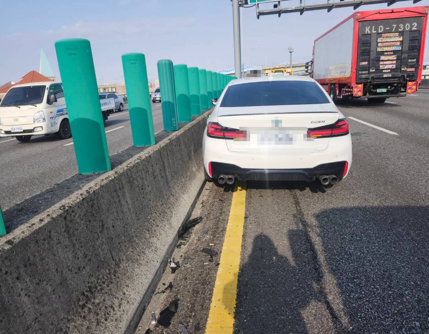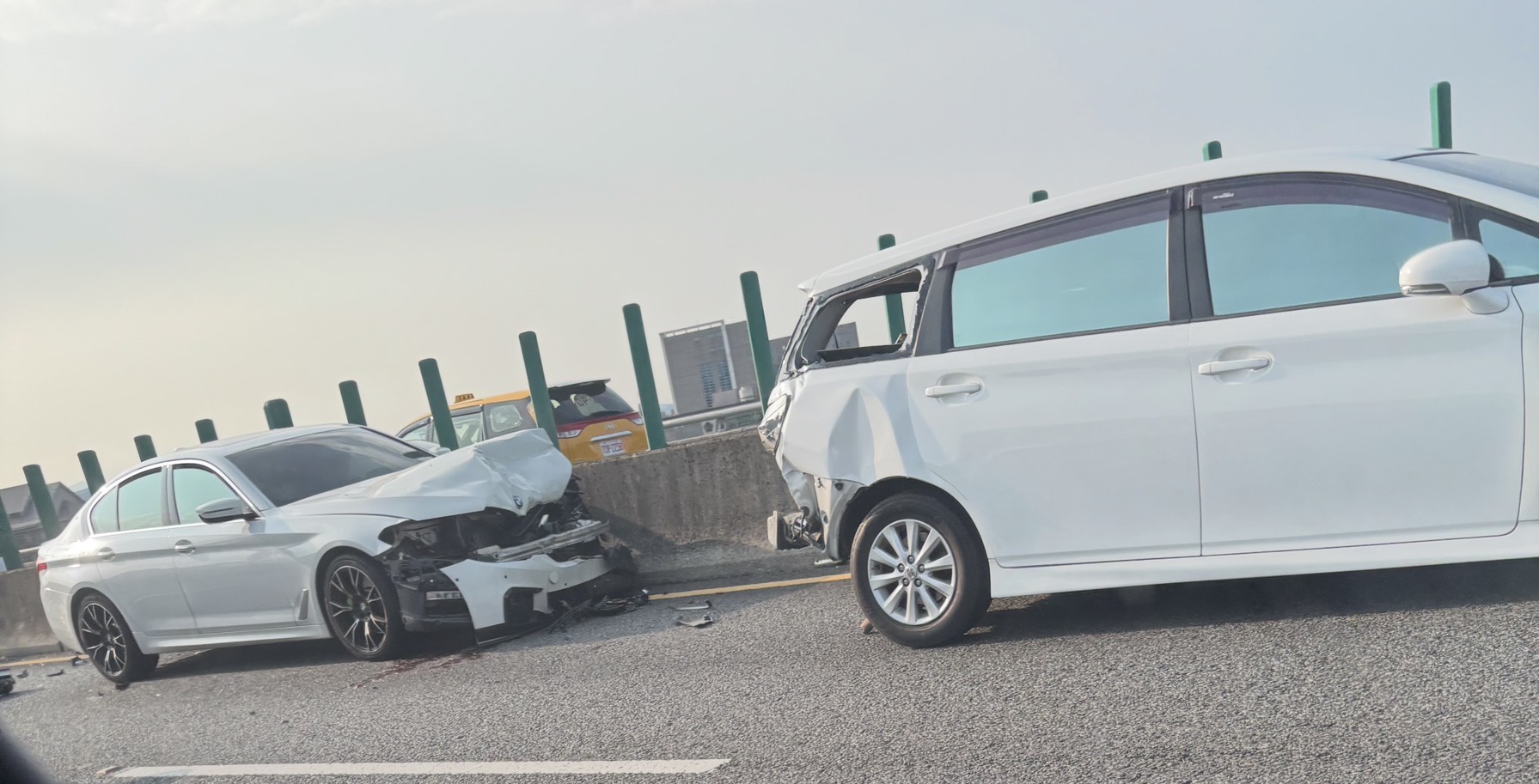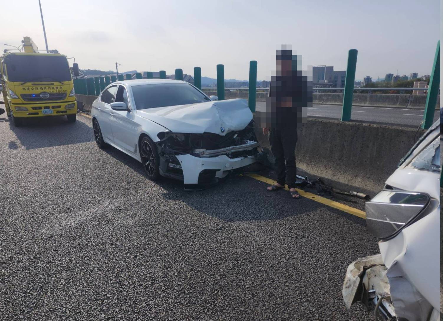 39歲游姓駕駛開著白色BMW在內側車道呼嘯而過,沒想到前方32歲陳姓駕駛的車突然出現在眼前,煞車已經來不及,就這樣「咚」的一聲,直接親上去!現場畫面慘不忍睹,BMW車頭整個「開花」,引擎蓋扭曲變形像被揉過的紙團,前保桿碎片噴飛四散;陳男的車尾更是被撞得體無完膚,後保桿幾乎解體,零件撒了一地。