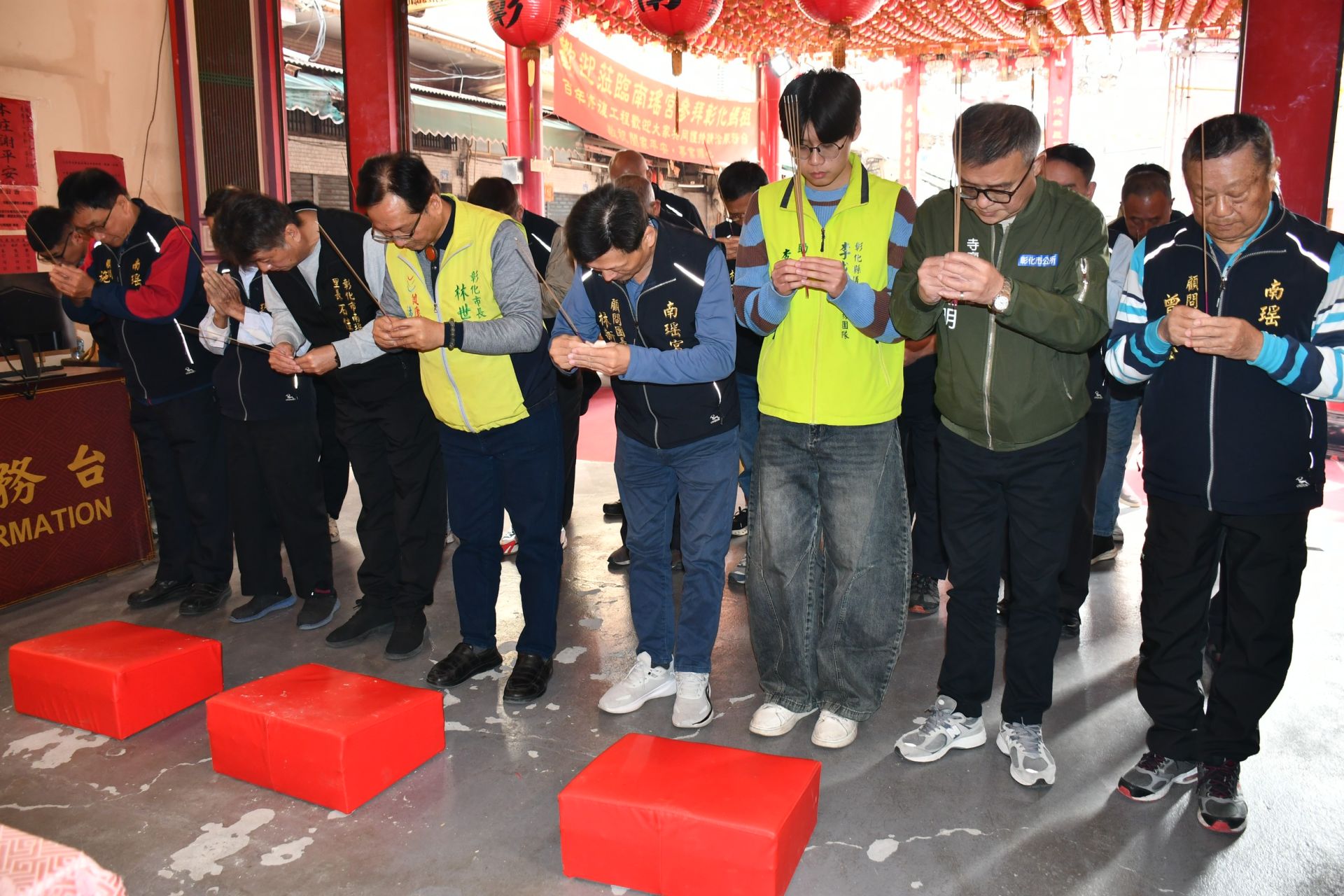 圖說:林世賢率媽會及寺廟寺人員向臨時行宮的媽祖稟告南瑤宮第一期工程已竣工