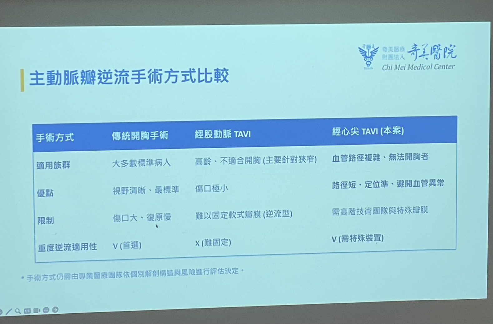由於病人嚴重瓣膜逆流導致心臟負荷加重,且合併多重複雜主動脈解剖與既往主動脈介入手術史,考量傳統正中開胸外科主動脈瓣置換(Surgical AVR)風險極高,團隊改採經心尖微創路徑成功完成瓣膜置換,術後恢復良好,8天即順利出院,充分展現奇美醫院在高難度結構性心臟病治療上與跨科整合照護的能力,即使是解剖複雜、風險極高的病人,也能獲得最安全、最適合的治療。