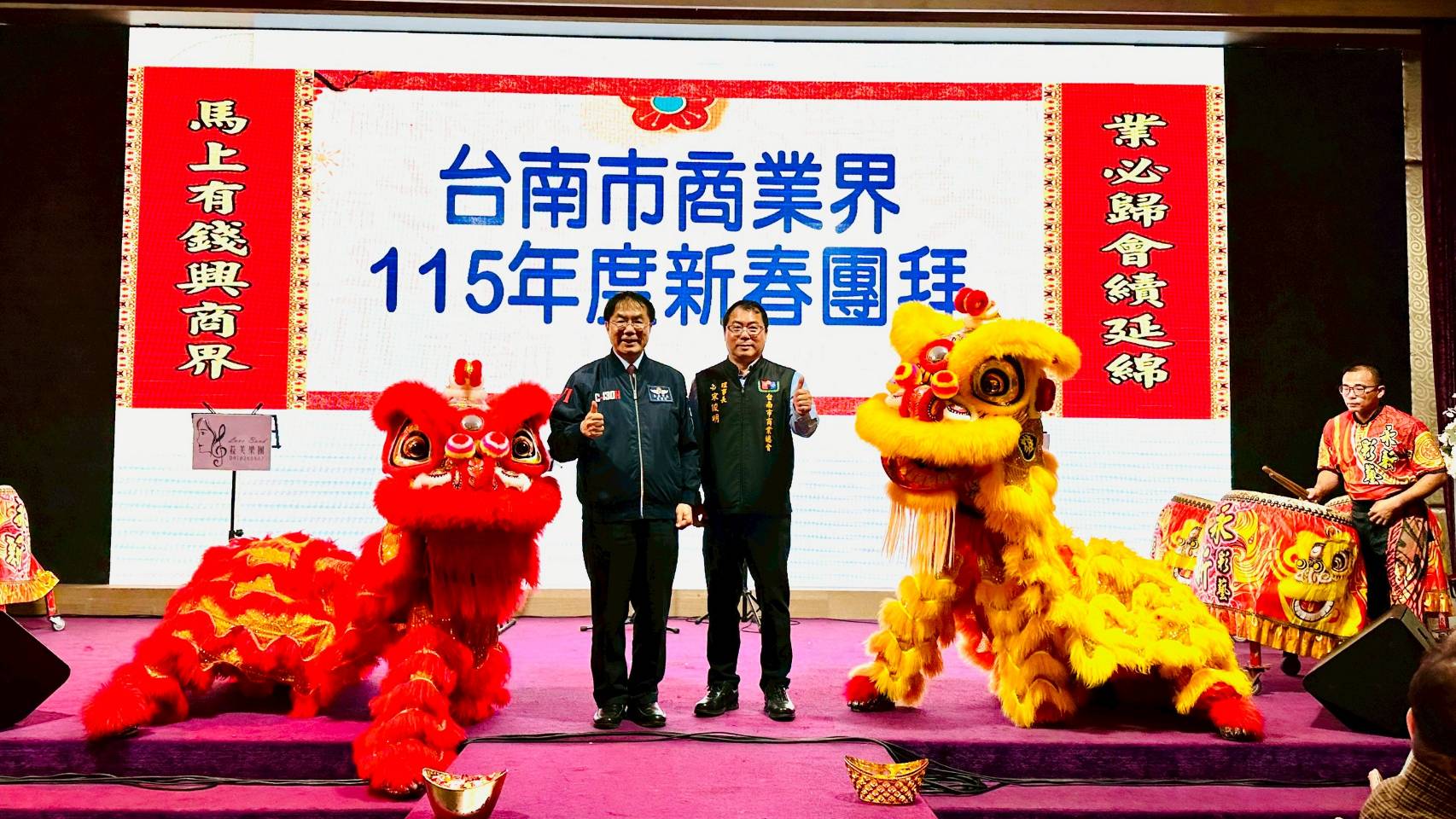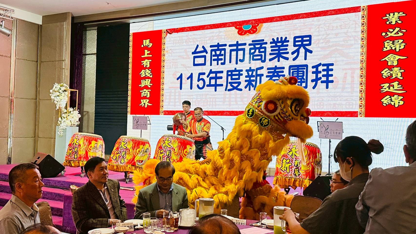 活動現場氣氛熱絡舞龍舞獅,與會貴賓互賀恭禧,展現臺南商業界團結向心的精神。商業總會宋俊明理事長表示,商業總會作為各行各業的重要平台,長期扮演政府與產業之間的橋樑角色,不僅協助會員反映產業需求,也持續推動產業交流與合作,期盼透過團拜活動凝聚商界力量,迎向嶄新的發展契機。