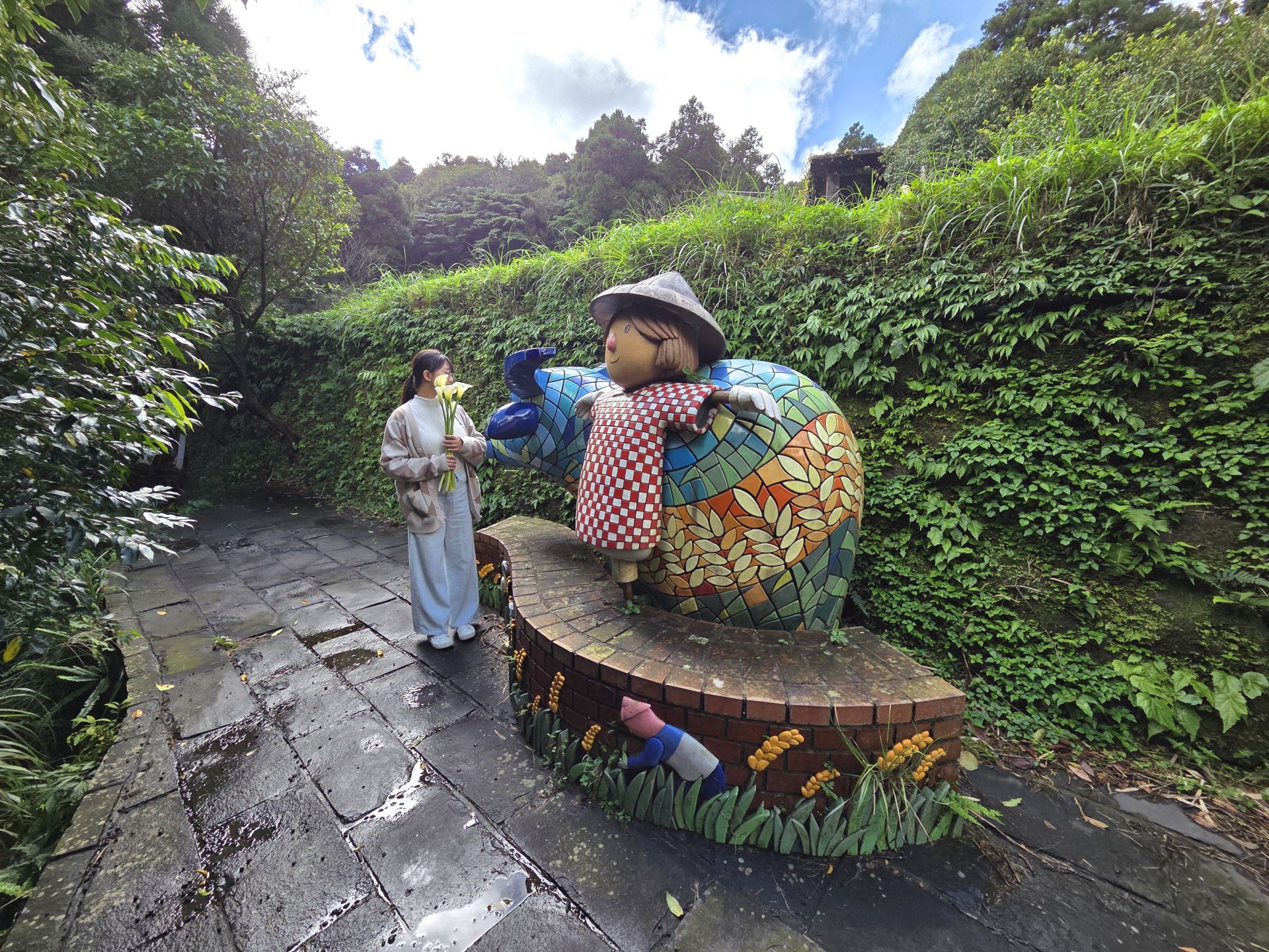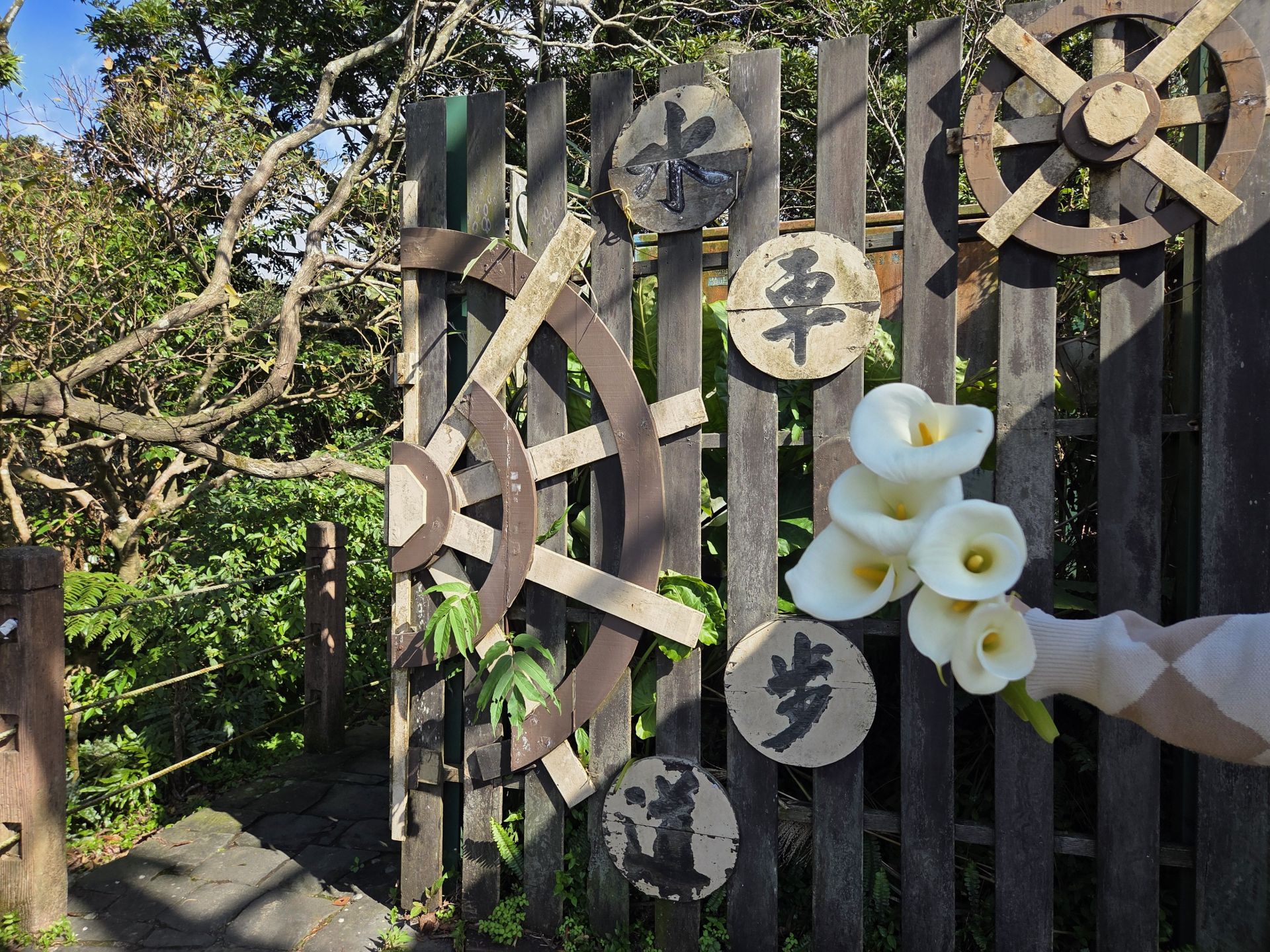 來到湖田除了採海芋,更推薦走訪「水車寮水圳步道」,沿途不僅能欣賞美景,聆聽清澈溪流宛如樂章一般的流水聲,還能見到以四季農耕為題的裝置藝術,其中「秋收平台—ㄟ米間」透過現代壓克力解說板與原始牆面的融合,生動呈現傳統碾米技藝,賦予歷史遺跡全新的保存意涵。