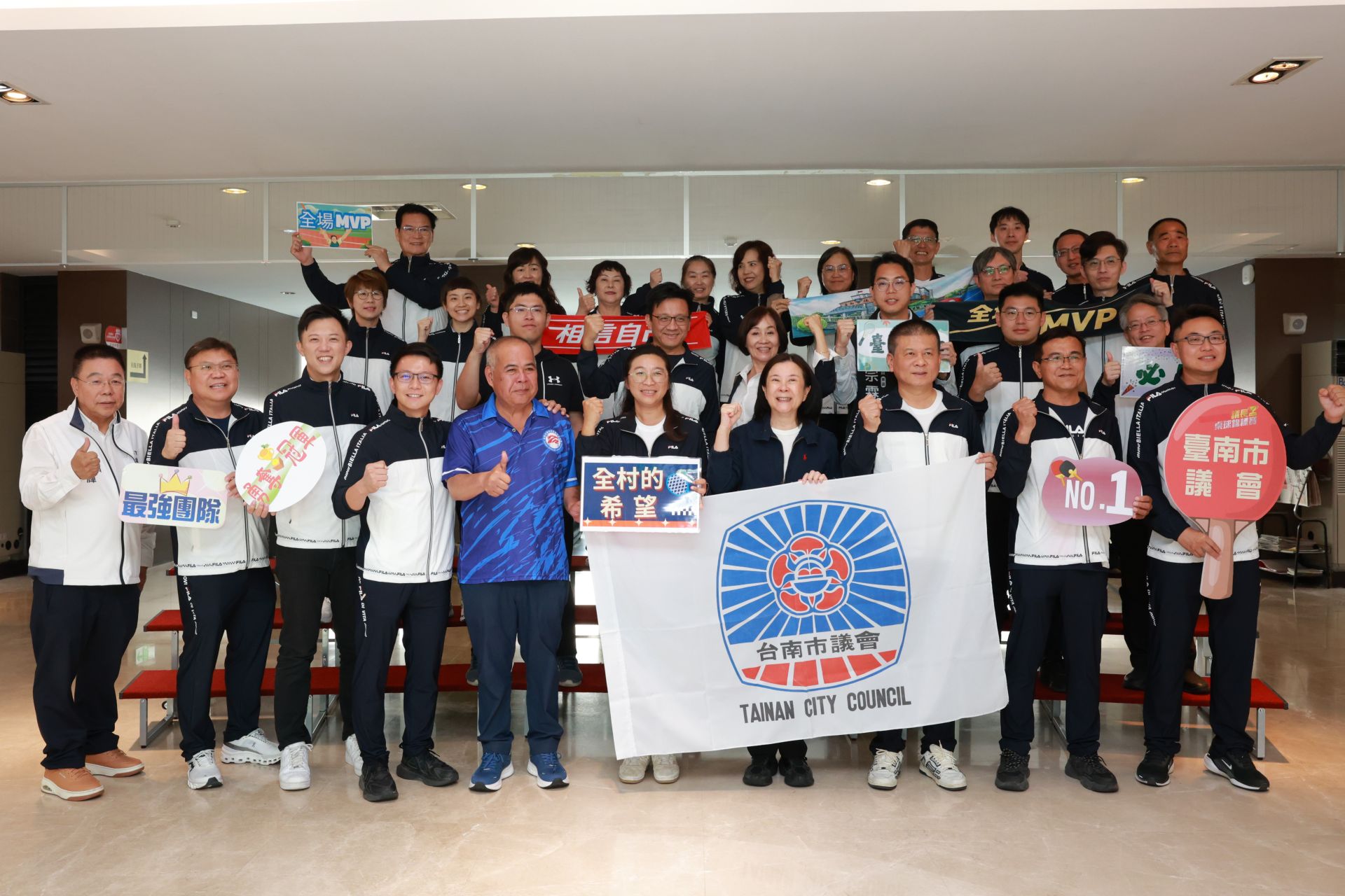 今年全國地方議會議長盃桌球錦標賽由苗栗縣議會主辦,326日、27日於苗栗縣巨蛋體育館舉行,臺南市議會桌球代表隊由議長邱莉莉擔任總領隊,副議長林志展擔任副總領隊,包括隊長沈家鳳、李宗翰、陳秋宏、朱正軒、黄肇輝、周嘉韋、李啟維、李宗霖、陳皇宇、王宣貿、施余興望、王家貞、林依婷議員及員工等共計29位選手參加,陣容堅強。蔡育輝、黃麗招及邱昭勝議員也到場為代表隊加油。
