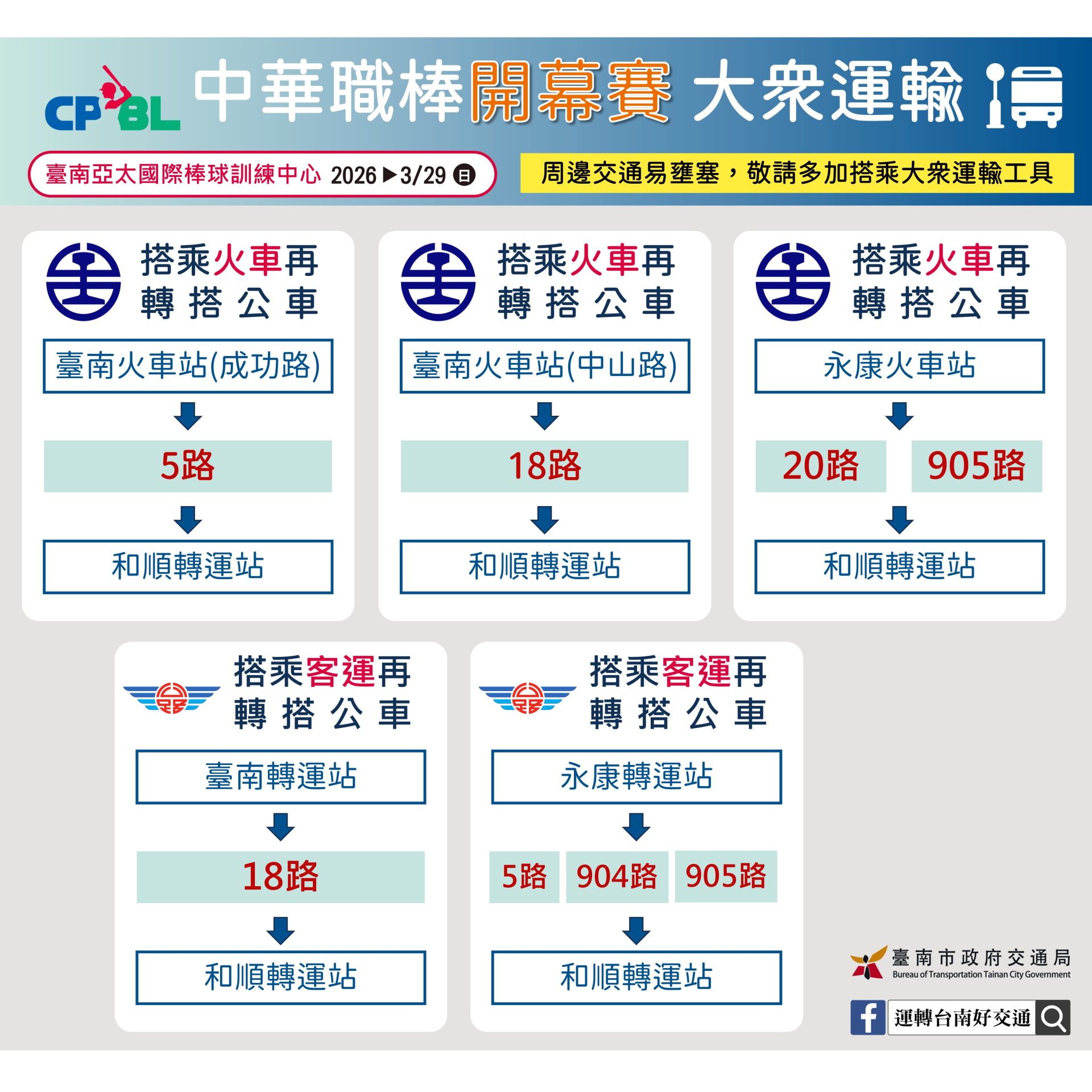 交通局局長王銘德表示,成棒主球場西側即為和順轉運站,轉運站共有6條大台南公車行經,每日提供約229班次服務。外地前來觀賽的球迷,可搭乘台鐵於台南火車站轉乘5路、18路公車,或於永康火車站轉乘20路、905路公車,另搭乘客運前來的民眾,可於臺南轉運站轉乘18路公車,或於永康轉運站轉乘5路、904路、905路公車,均可在和順轉運站下車,步行約10分鐘即可抵達成棒主球場。在地球迷或觀賽民眾從市區(中西區、北區、南區)往球場可搭5、18路公車;東區可搭5、20路公車;永康區可搭乘5、20、905路公車;安南區可搭乘18、904、905、橘3路公車;善化、安定地區則可搭乘橘3路公車至和順轉運站。民眾乘車前,可至大臺南公車網站https://2384.tainan.gov.tw/ 查詢相關資訊。