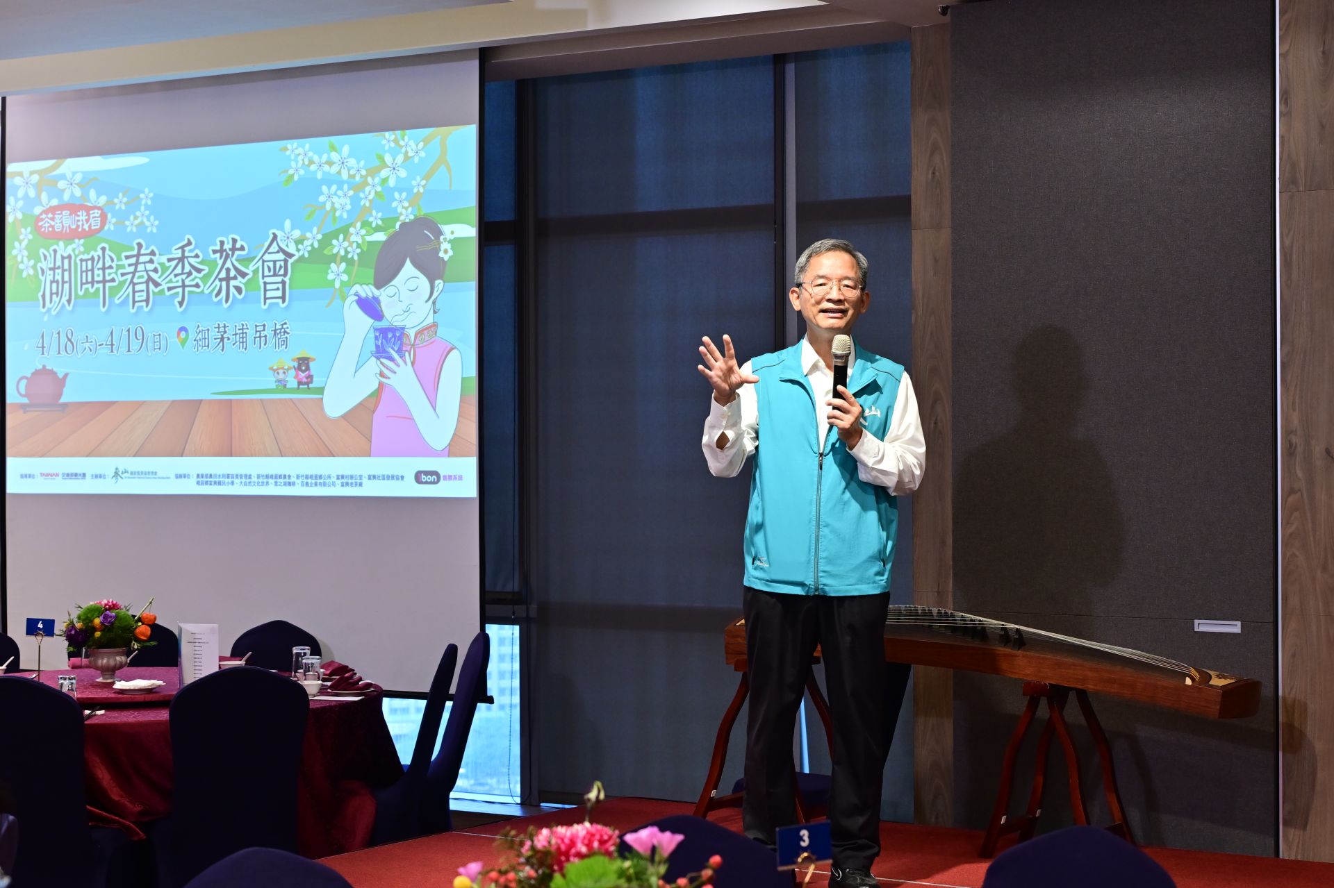 ▲115年「茶韻峨眉」湖畔春季茶會宣傳活動,參山處副處長廖錫標致詞大力推廣峨眉茶文化亮點,並說明這場茶會現場結合古箏、胡琴、竹笛等東方樂音演出,營造沉浸式五感體驗。(圖/參山處提供)