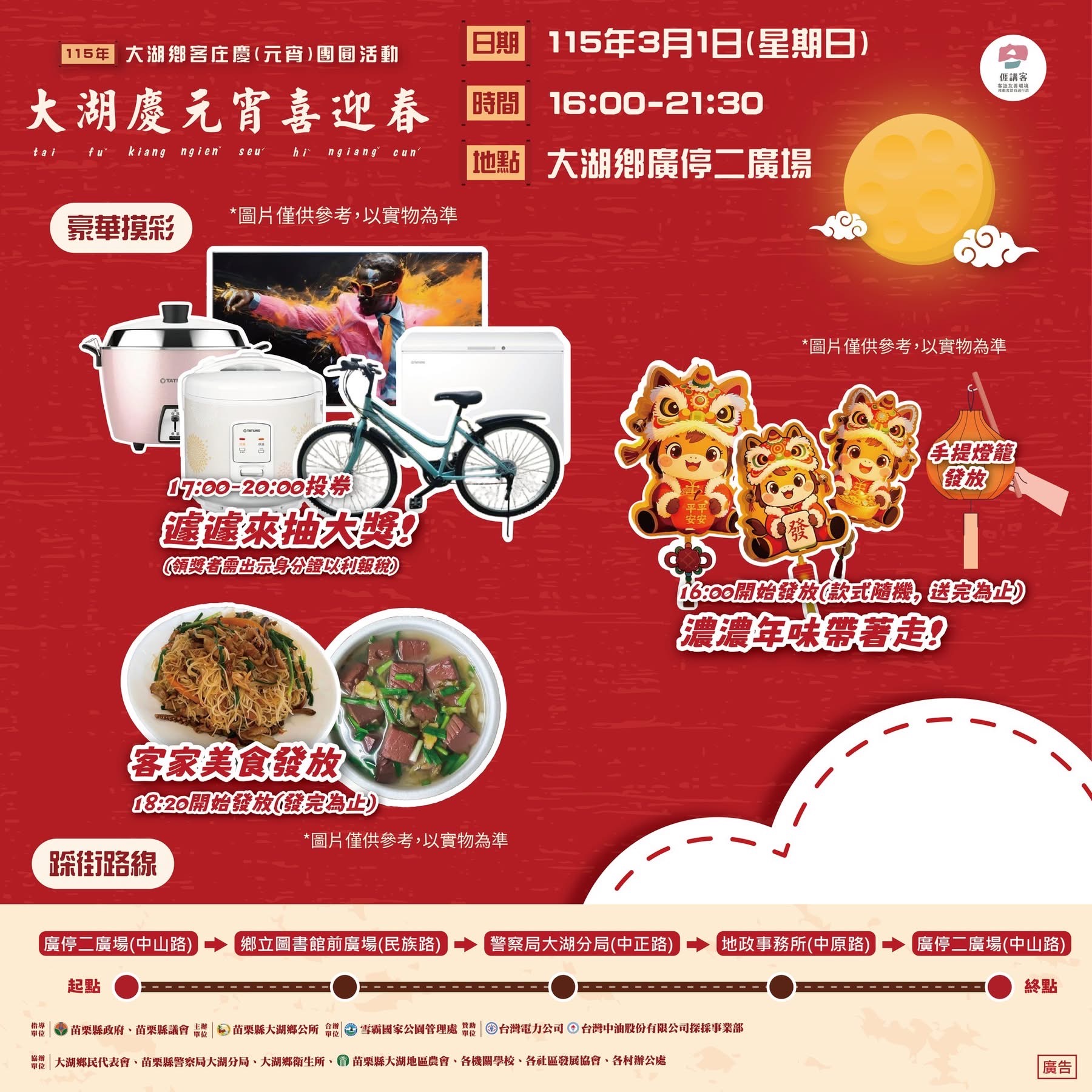活動現場規劃多元精彩內容,包含藝文表演及豐富摸彩活動,邀請鄉親好友一同參與,在歡樂氛圍中共度元宵佳節,攜手創造屬於大湖鄉的節慶回憶。會場亦準備多款道地美食,如客家酸菜豬血湯、客家炒米粉,供鄉親及遊客品嚐,感受濃厚的客庄年節風味。
