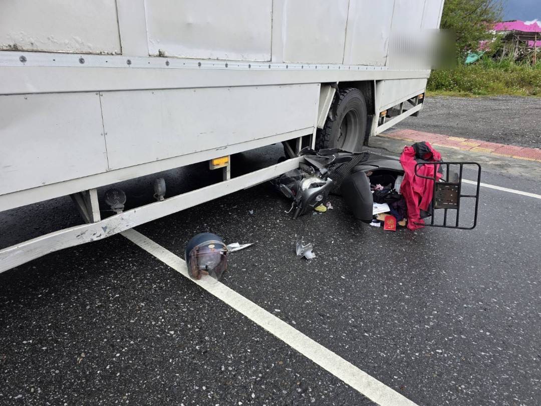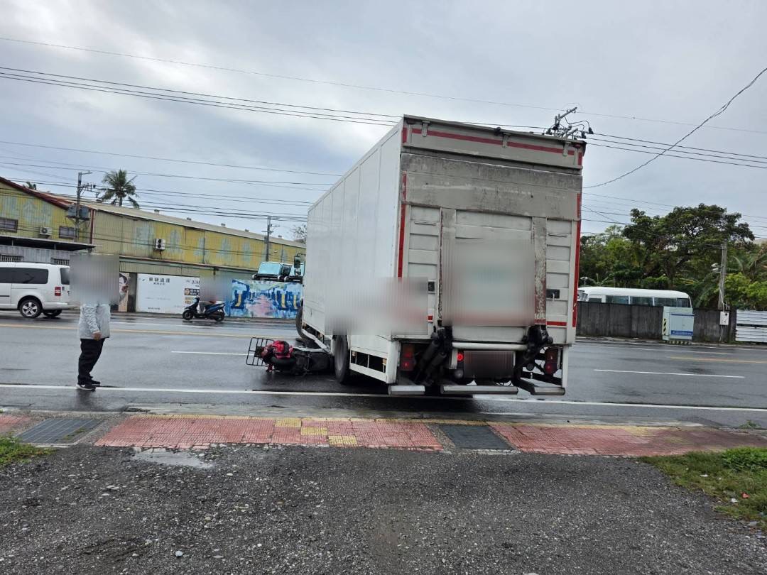花蓮吉安鄉大貨車撞倒機車,機車卡在貨車底下。翻攝畫面